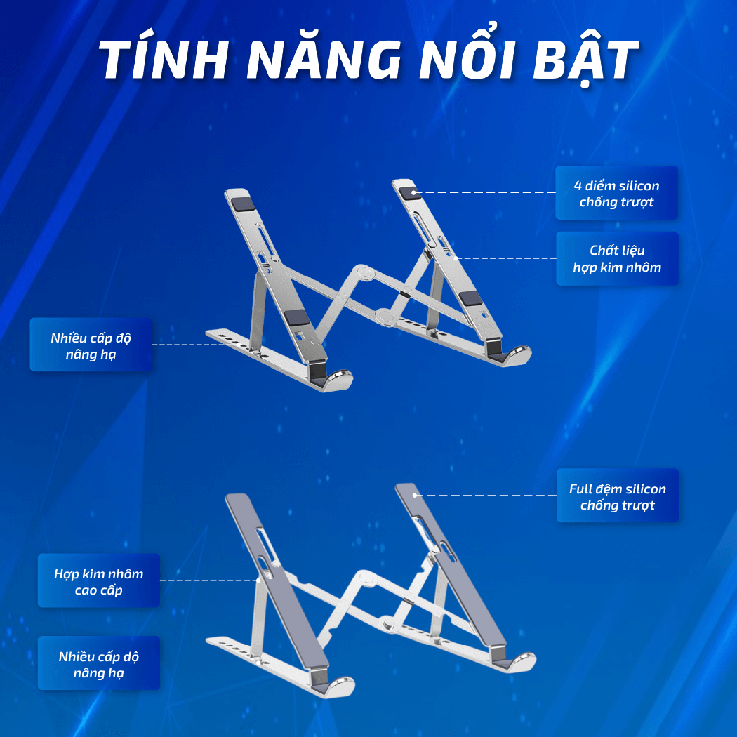 Khung hợp kim nhôm bền chắc, nâng nhiều. nấc chuẩn công thái học giúp giảm mỏi cổ – vai – lưng, bề mặt thoáng hỗ trợ tản nhiệt. Đệm silicone chống trượt bảo vệ máy, gập. gọn nhẹ nhàng, phù hợp laptop 11–15 inch.