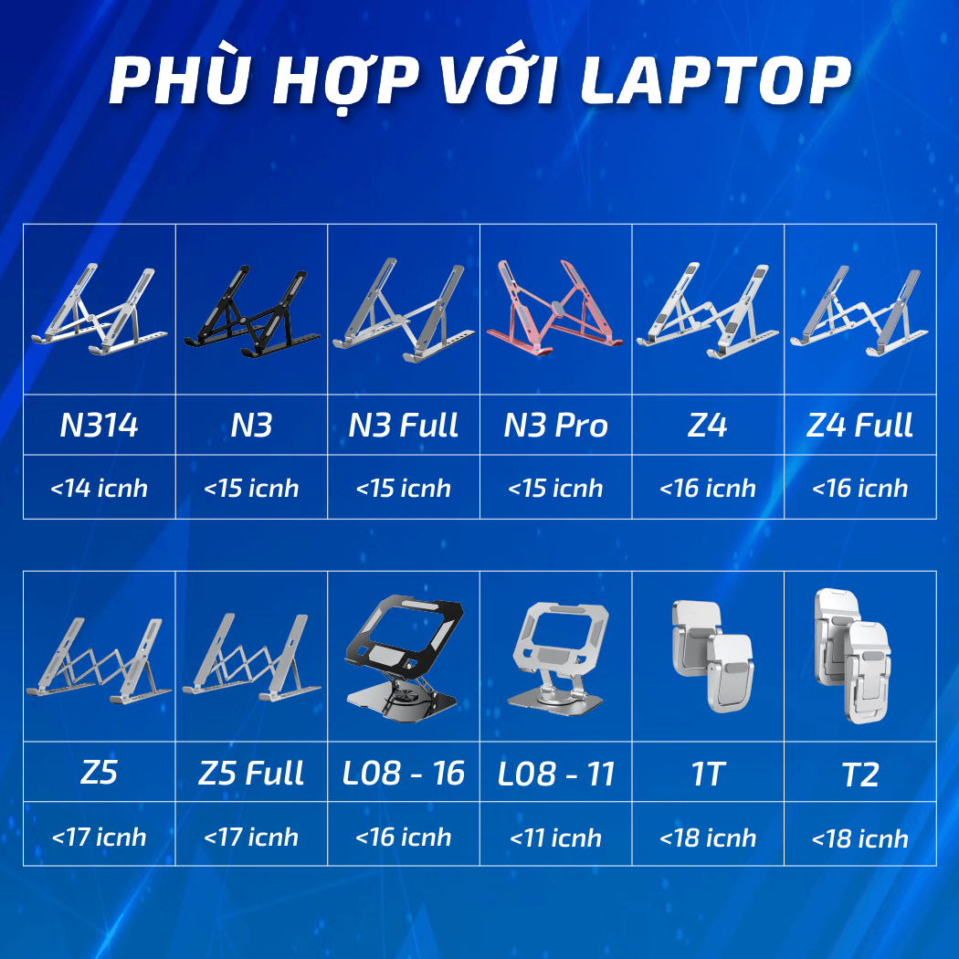 Bề mặt giá đỡ được tích hợp đệm silicone chống trượt, hạn chế trầy xước thiết bị. Nhiều mẫu có khả năng gấp gọn, thuận tiện mang theo khi di chuyển. Phù hợp cho laptop từ 11–17 inch và cả máy tính bảng. Đây là lựa chọn lý tưởng cho nhân viên văn phòng, sinh viên, người làm việc từ xa hoặc người dùng MacBook cần một setup gọn – thoáng – tiện lợi.